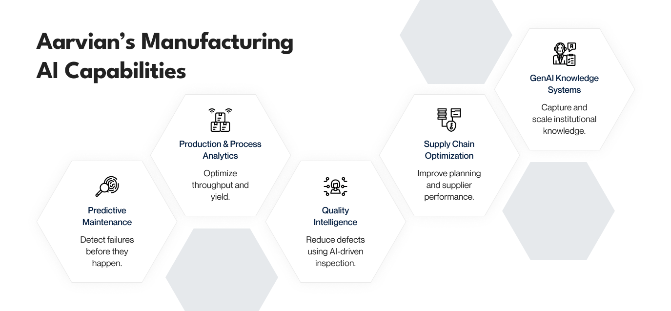 Aarvian embeds AI across production, quality, maintenance, and supply chains—driving operational excellence at scale.